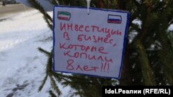 За пару минут до акции в чате пострадавших от действия банков заявили, что акция не состоится – на улице мороз. Но несколько вкладчиков Татфондбанка и Интехбанка все же нарядили сегодня елку напротив правительства республики открытками, на которых написали, что не получили в этот Новый год. За акцией наблюдал корреспондент "Idel.Реалий".