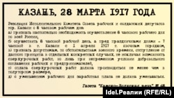 3) Что 8 часовой рабочий день в настоящее время уже проведен в Петрограде, Москве и других городах, а также во всех технических и артиллерийских заведениях военного ведомства, Совет рабочих и солдатских депутатов г. Казани постановил: