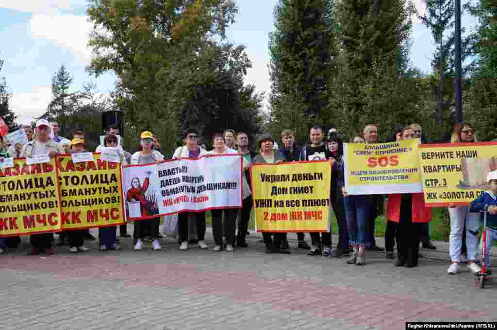 "Казань — столица обманутых дольщиков!", "Мы хотим в свой дом!", "Президент РТ, спасибо вам за мое бездомное детство", "Ждем возобновления строительства", "Наши дети тоже хотят жить в своих квартирах" — с такими плакатами вышли митингующие. Смотрите другие наши фотогалереи здесь.