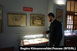 — В основном предметы собирались в советское время, поэтому получился такой перекос в пользу красных. А экспонаты, связанные, например, с Гаязом Исхаки, появились уже позднее, в 1990-е годы: кое-что из Турции привозили его потомки, — рассказывает Зайцев. — Вот этот электронный мэппинг крупными штрихами показывает нам начало XX века: последнего царя, "Кровавое воскресенье", германскую войну и февральскую революцию. Вот, собственно, "царская" витрина с памятными медалями и сувенирными стаканами. Рядом раскрывается тема татар в начале ХХ века — их национальная пресса, театр, интеллектуальное течение джадидизма. А здесь все, что связано с Временным правительством, — жетоны, листовки "Займа Свободы", — Виталий Зайцев ведет нас от экспоната к экспонату и рассказывает историю того времени.