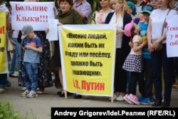 Две женщины с плакатом, на котором цитата Путина, Ильсия Нурмиева и Любовь Рысакова, — из поселка Карьер. Они рассказывают, что о грядущих преобразованиях народ из Карьера узнал от соседей из Новой Сосновки. Аналогично — посредством сарафанного радио — весть разнеслась по другим поселкам.