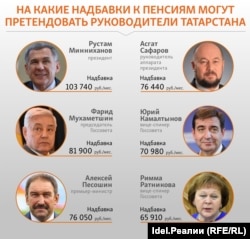 Руководство Татарстана, поддержав пенсионную реформу, оказалось не готово сократить собственные преференции и получать в будущем такую же пенсию, как и обычные граждане (сейчас в республике средняя страховая пенсия составляет чуть более 13 тысяч рублей). "Idel.Реалии" решили посчитать, на какие доплаты после ухода на пенсию могут рассчитывать первые лица РТ. Выяснилось, что Рустам Минниханов, если он уйдет завтра на пенсию, будет получать доплату более чем в 100 тысяч рублей ежемесячно. Спикер Госсовета Татарстана Фарид Мухаметшин — минимум 80 тысяч. Не исключено, что реальные доплаты будут значительно выше, поскольку власти постоянно увеличивают их размеры.