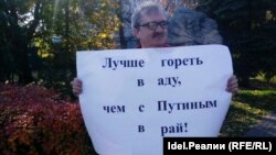 Путин сказал, что те, кто применит ядерное оружие против России, "сдохнут", а граждане России попадут в рай. Активист российского движения "Открытая Россия" вышел на одиночный пикет с плакатом: "лучше гореть в аду, чем с Путиным в рай".