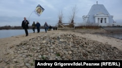 На этом церемония закончилась, и участники двинулись от храма обратно к дамбе. Возглавлял процессию председатель ОРК РТ Михаил Щеглов, вооруженный хоругвью "Русь святая, храни веру православную", за ним шествовали несколько мужчин в кубанках и камуфляже (как выяснится, уже на конференции — гости из "окопов Донбасса") и просто люди в гражданском. Процессия насчитывала ровно двенадцать человек, что, конечно, выглядело очень символично.