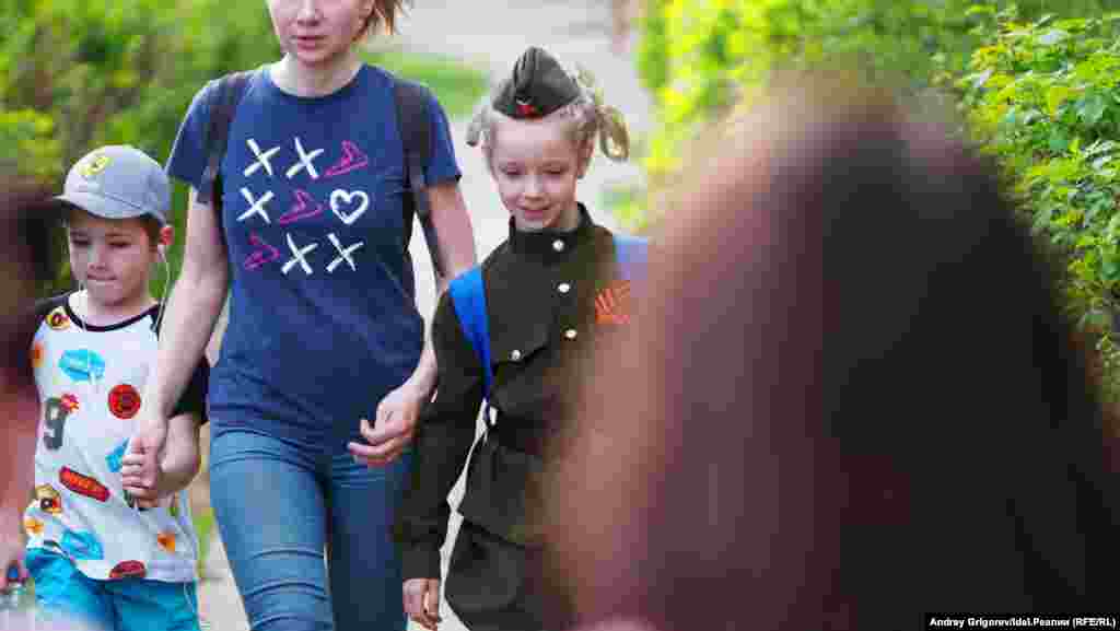 Георгиевские ленты и автомобильные наклейки, которыми уже давно никого не удивишь, оказались потеснены зёлеными пилотками с красными звёздами. Так что теперь георгиевские ленты, вокруг которых поломали столько копий, практически незаметны в пестрой толпе (возможно, потому, что они уже на каждом втором встречном). Тут, правда, тоже заметна некоторая эволюция — некоторые ленты украшены значками и цветочными бутонами — но куда больше бросаются в глаза именно красноармейские пилотки. Торговцы ими расположились у входа в казанский парк Победы. Недорого, 200 рублей — штука. Правда, на взрослые головы головных уборов у продавцов немного. Не то большие размеры уже расхватали, не то основная целевая аудитория — дети.
