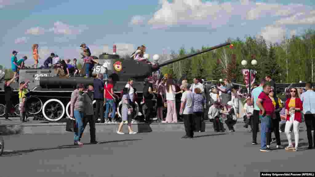 Есть в парке Победы, правда, давно опробованные магниты, которые и в этот раз перетянули на себя большинство посетителей: многочисленная военная техника. Дети — в пилотках и без — оседлали танки, пушки, самолеты. Родители снимают их на смартфоны или, напротив, с негодованием требуют, чтобы не забирались слишком высоко. Из дула ближайшего к выходу парка торчит букетик увядших тюльпанов. Праздник удался.