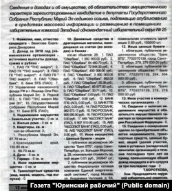 Газета "Юринский рабочий" (единственное печатное издание, выходящее в Юринском районе) опубликовала 12 июля сведения о доходах Екатерины Вахитовой. В графе "Доход за 2018 год, сумма в рублях" стоял прочерк. Член ЦИК Марий Эл с правом решающего голоса Владимир Болтачев сообщил "Idel. Реалиям", что попросил разъяснения у руководства избиркома по этом поводу.