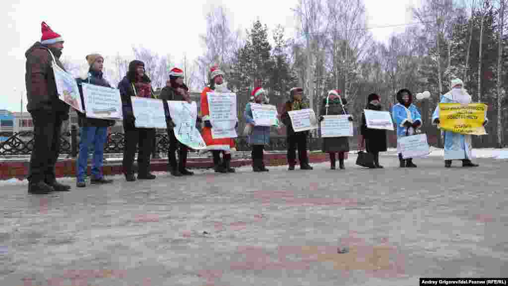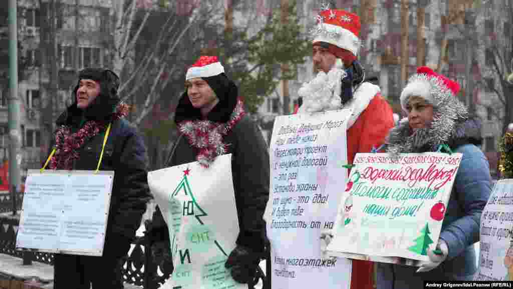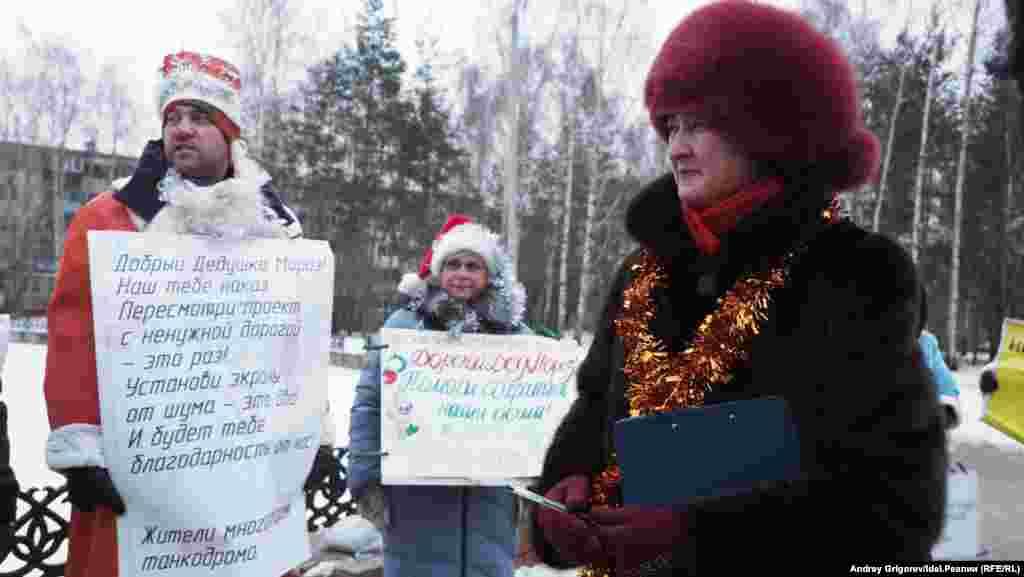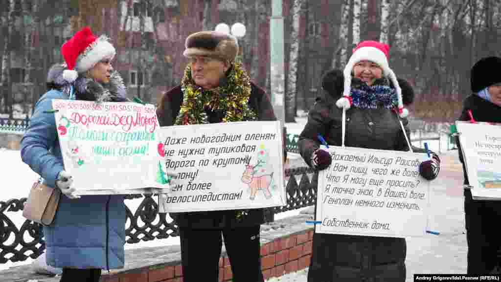В последнее воскресенье уходящего 2019-го жители казанского микрорайона Танкодром вновь вышли на акцию протеста. На сей раз — в новогодних нарядах костюмах снегурочек и дедов морозов и мишурой, накинутой на плечи. Правда, настроение собравшихся было совсем не новогодним, в руках люди держали те же плакаты, что и два месяца назад — с просьбами не сносить их дома и чтить частную собственность.