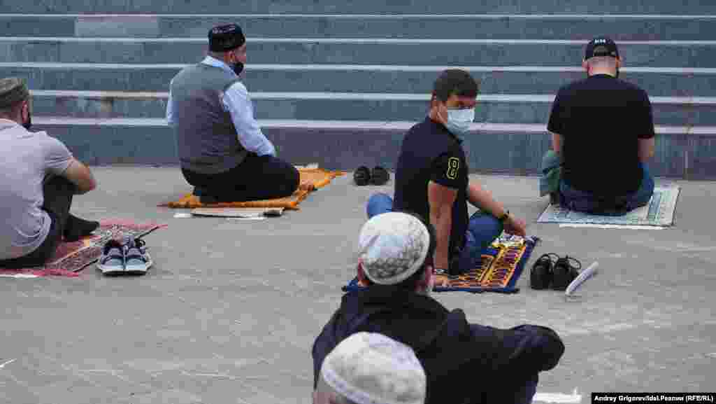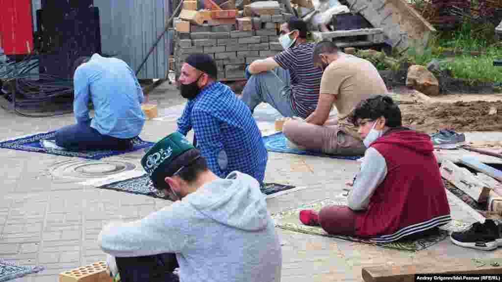 Теперь их посещение разрешено — но только в масках и перчатках, кроме того, необходимо соблюдать социальную дистанцию. Корреспондент "Idel.Реалии" побывал на первом пятничном намазе в казанской мечети "Гаилә". Эта мечеть расположена в микрорайоне "Азино", где плотность населения очень высокая, потому обычно пятничные намазы здесь собирали одновременно порядка 700 прихожан (как внутри здания, так и во дворе) — однако в эту пятницу, 5 июня, мечеть смогла принять лишь около 200 человек. Во дворе и внутри мечети нанесли специальную разметку — полоски, рядом с которыми надлежало класть молельные коврики.