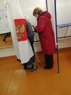 На избирательном участке №1837 в Чебоксарах избиратель пенсионного возраста заходит в кабину для голосования с наблюдателем от "Единой России", которая диктует за кого голосовать.
