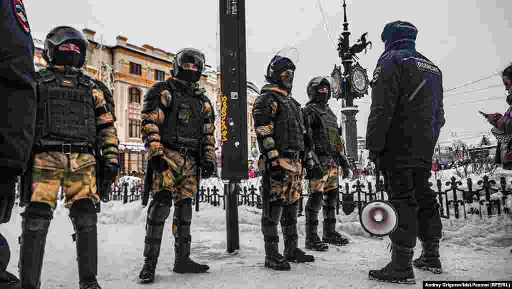 Изначально участники протеста в Казани планировали пройти по пешеходной улице Баумана от часов к кремлю — но это удалось далеко не всем. В два дня, 23 января, площадь с часами заняли полиция с росгвардией, а саму Баумана — перекрыли. Стихийно родилось предложение — идти на площадь Свободы, к Кабмину РТ. Такое отступление от планов, судя по всему, оказалось неожиданным для силовиков. Протестующие заняли площадь напротив дома правительства раньше, чем туда успели стянуть полицию с росгвардией.