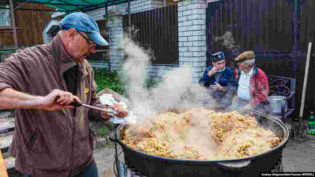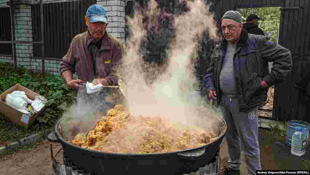 По завершении церемонии все пришедшие могли отведать плов. Огромный казан с блюдом уже ждал во дворе.