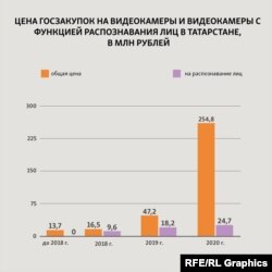 "Idel.Реалии" удалось обнаружить 17 закупок, договоров и контрактов, связанных с видеонаблюдением в 2020 году. И это абсолютный рекорд по такого рода "покупкам". Интересно еще и то, что это рекорд в том числе и по финансированию на устройства с функцией распознавания лиц. Так, с 2014 по 2018 год редакции удалось найти только восемь закупок, так или иначе связанных с видеонаблюдением.