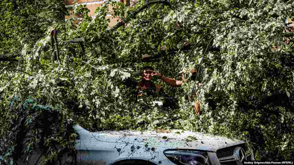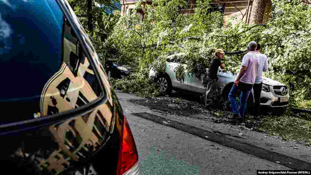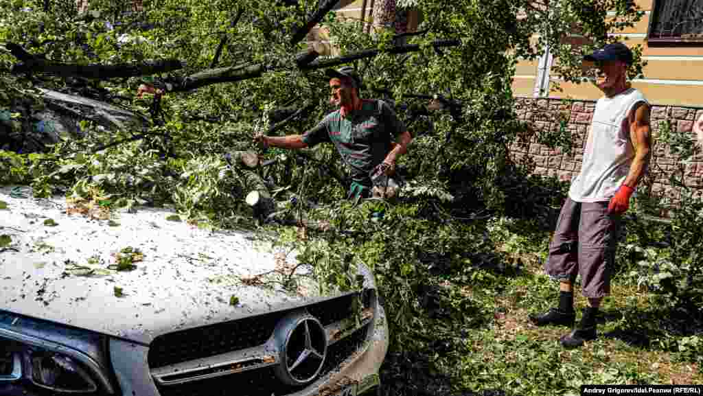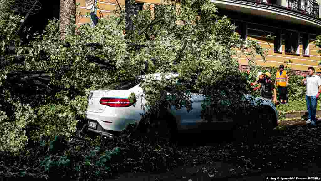 Свидетелем разбора завалов на фешенебельной улице Бассейная, спускающейся от Малой Красной к Пушкина мимо Верховного суда Татарстана, стал корреспондент "Idel.Реалии". Здесь дерево рухнуло сразу на несколько припаркованных у тротуара машин.