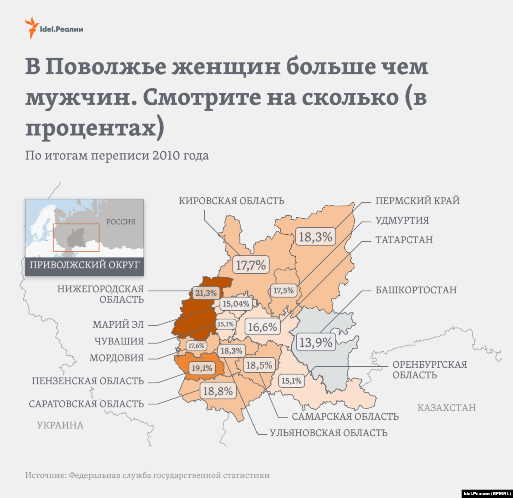 "Idel.Реалии" решили вспомнить результаты прошлой переписи. На этот раз посмотрим, на сколько женского населения в регионах ПФО больше, чем мужского. Всего регионах Поволжья женщин было от 13,9 до 21,3% больше, чем мужчин. Меньше всего (13,9%) разрыв в Башкортостане, больше всего (21,3%) в Нижнем Новгороде.