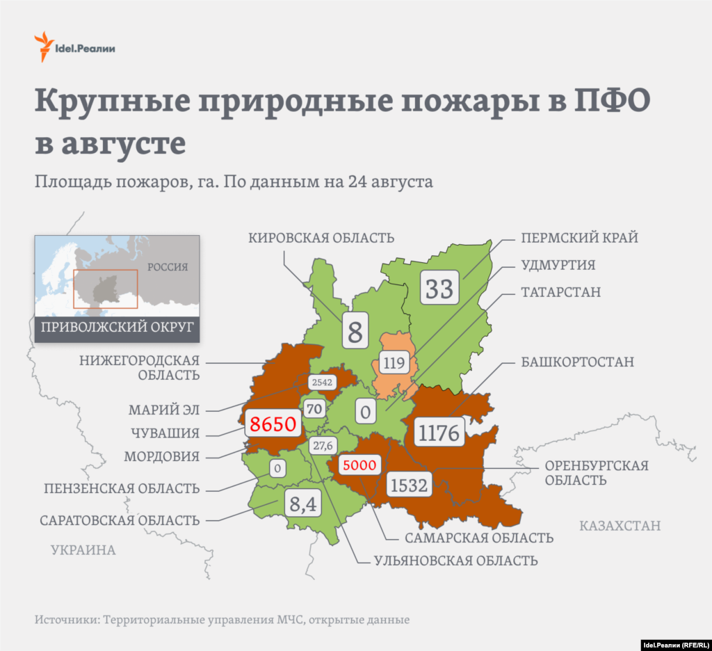 Самые крупные по площади возгорания пожары — в Нижегородской, Самарской областях, а также в республиках Марий Эл, Башкортостан и в Оренбуржье.