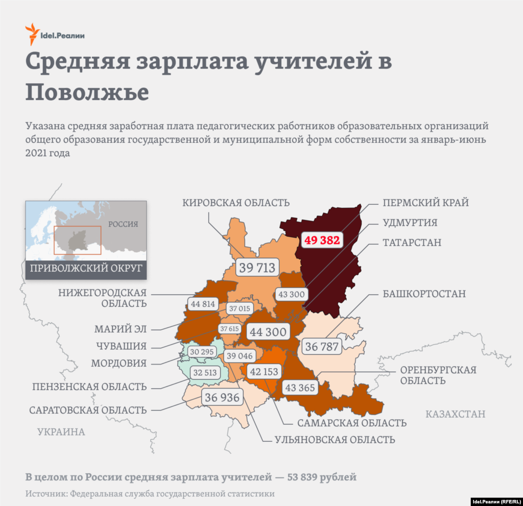 Самые большие зарплаты — в Пермском крае, а самые маленькие — в Мордовии.
