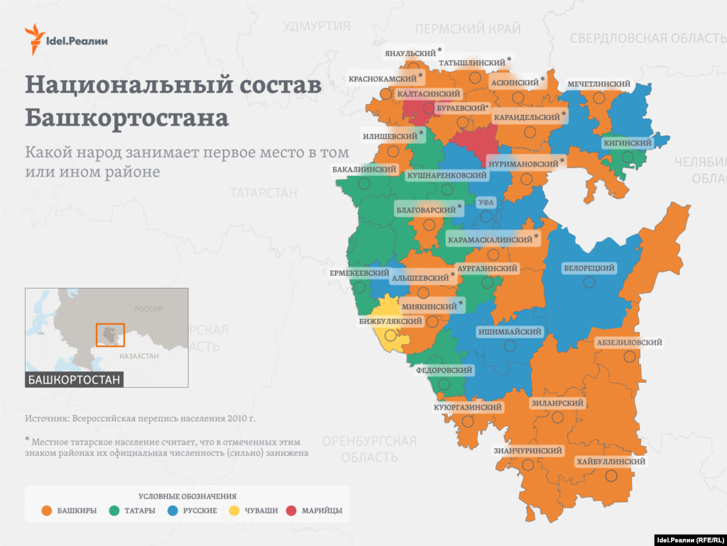 Эта карта показывает, какой народ занимает первое место по численности в том или ином районе Башкортостана.