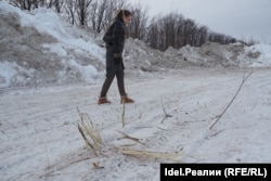 За спиной Виктории Оловянниковой высится одна из куч грязного снега.