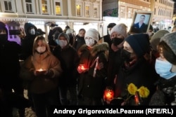 Участники зажигают свечи и хотят уже идти с ними и портретом "контрактника" по Баумана — но дорогу им преграждают полицейские с Чанкиным во главе.