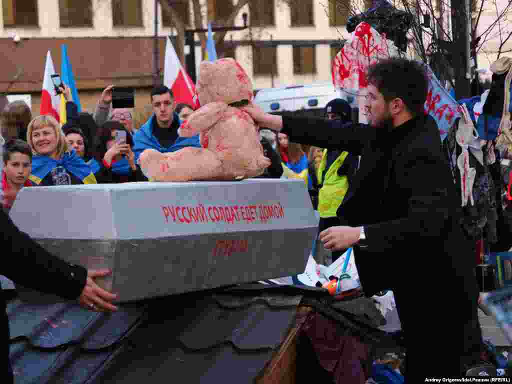Наибольший фурор вызвало появление у забора посольства собачьей конуры и гроба с надписью "Русский солдат едет домой. Груз 200".