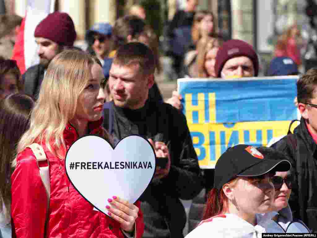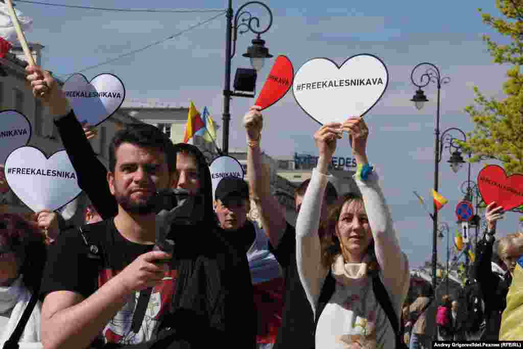 Участникам акции раздали сердечки с хештегом #freekalesnikava, эти сердечки люди во время митинга то и дело поднимали высоко над головами.