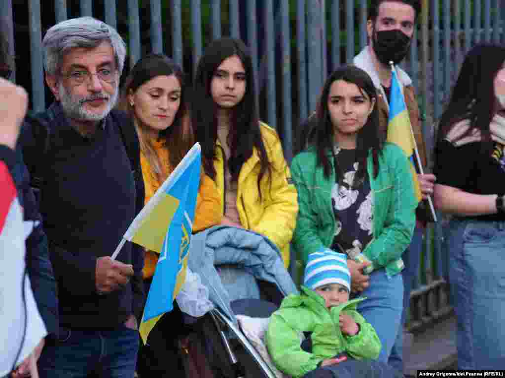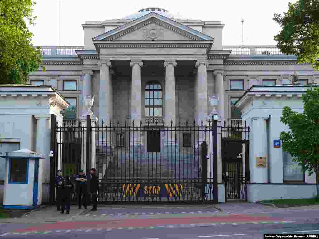 Около двух десятков человек, состоявших главным образом из россиян, собралось вечером 9 мая у посольства РФ в Варшаве, чтобы осудить начатую Россией войну с Украиной.
