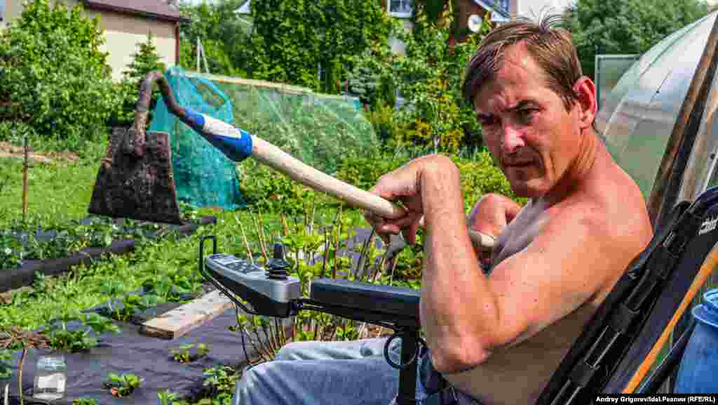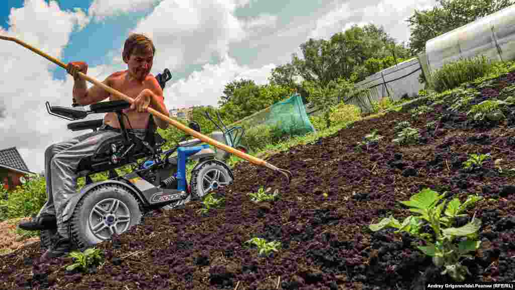 Казанец Антон Кайнов прикован к инвалидной коляске, но это не мешает ему самостоятельно справляться с многочисленными обязанностями по дому. Он живёт в частном доме в казанском посёлке Малые Клыки с большим огородом на заднем дворе и самостоятельно поливает овощи, пропалывает грядки и ухаживает за кустарниками. Правда, в прошлые годы (а снимки относятся к 2019-2020 гг.) делать ему это было намного легче, поскольку он передвигался на дорогих колясках, одну из которых он получил от президента РТ Рустама Минниханова после нескольких месяцев обивания порогов. Но те коляски уже вышли из строя на казанских дорогах, а на тех, которыми инвалидов обеспечивает соцстрах, особо не развернёшься. В конце августа коляска опрокинулась вместе с Антоном, когда он поливал огород. В итоге инвалид почти час пролежал на сырой земле, а теперь хочет засудить чиновников из Фонда социального страхования.