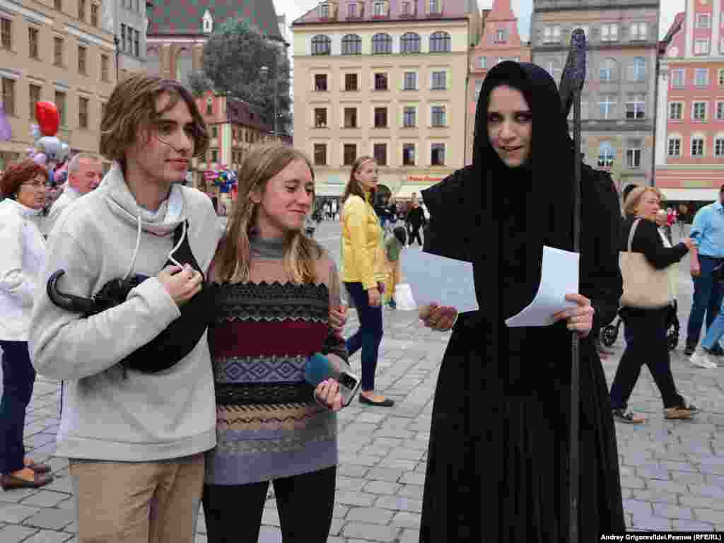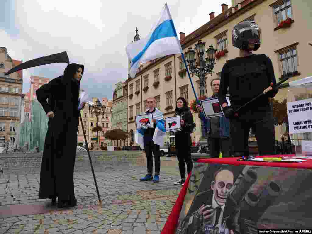 С начала нападения РФ на Украину россияне, живущие во Вроцлаве, проводят у городской ратуши театрализованные акции протеста. Очередная, в сентябре, была посвящена минувшим российским выборам. Участники постановки предлагали прохожим проголосовать.