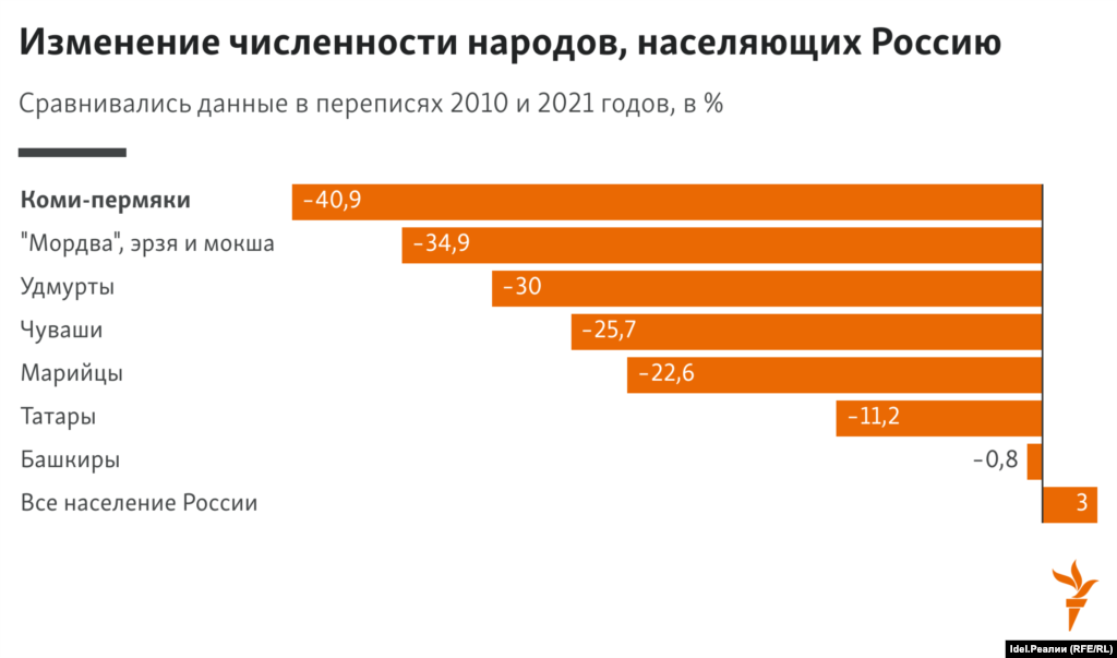 На 35% стало меньше "мордвы" (эрзя и мокши) — 744,2 тысячи человек в 2010-м против 484,5 тысячи в 2021 году); на 30% — удмуртов (552,3 тысячи человек в 2010-м и 386,5 тысячи человек в 2021 году) и более чем на 20% — чувашей (1,4 млн человек в 2010-м против 1 млн человек в 2021 году) и марийцев (547,6 тысячи в 2010-м против 423,8 тысячи человек в 2021 году).