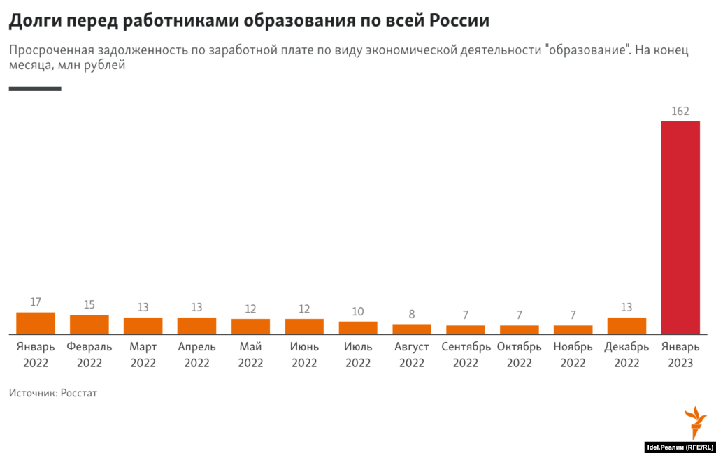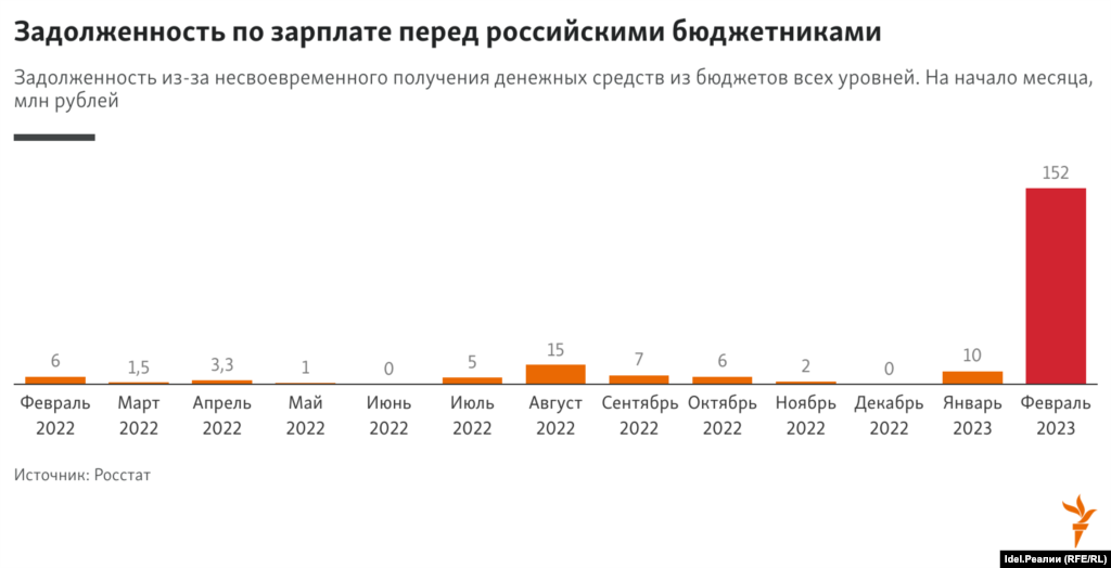 Задолженность по зарплате из-за несвоевременного получения средств из бюджетов всех уровней выросла в 15 раз. К январю 2023 года долги бюджета по зарплатам составляли 10 млн рублей, к февралю они резко выросли до 152 млн рублей. А на начало декабря задолженность была и вовсе нулевой.