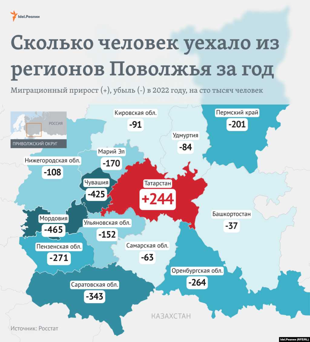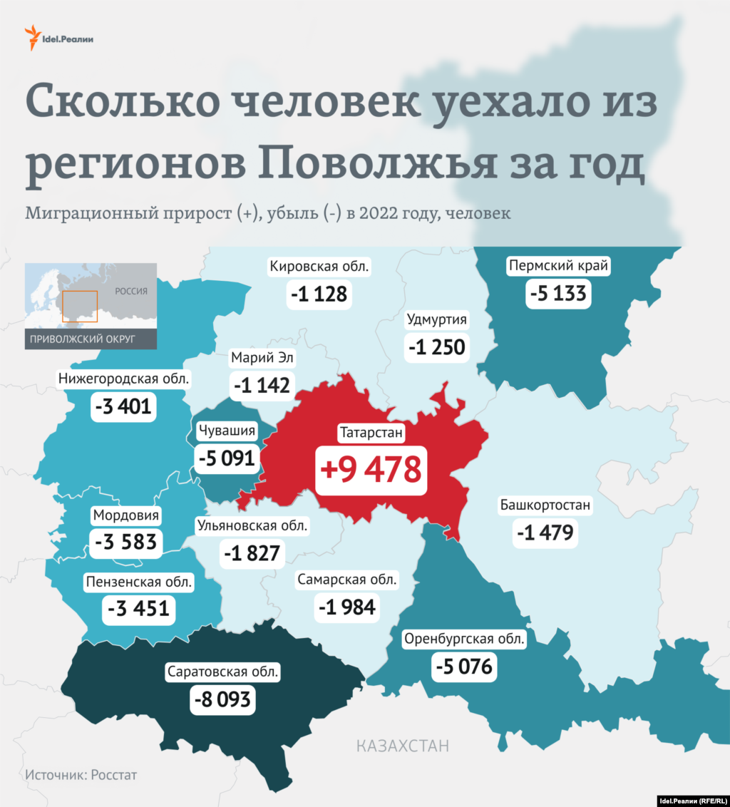 Почти в половине регионов Поволжья миграционная убыль не превышает двух тысяч человек.