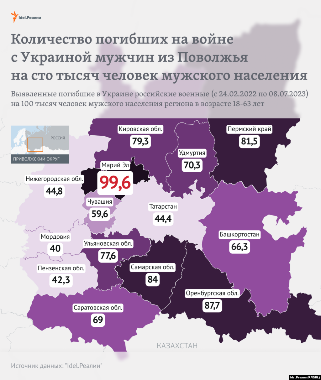 По количеству погибших мужчин на первое месте вышел Башкортостан — 791 человек. На втором месте Самарская область с 778 погибшими с начала войны. Следом идут Пермский край (603), Татарстан (508). Меньше всего выявленных погибших в Мордовии — 99 человек.