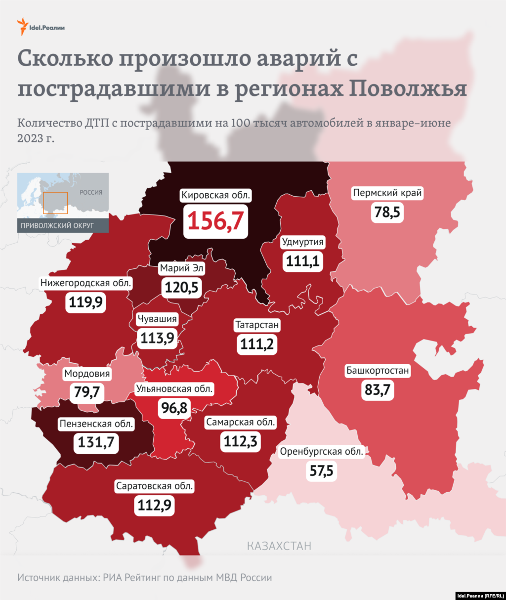 Самая низкая аварийность с пострадавшими зафиксирована в Оренбургской области, где по итогам первого полугодия 2023 года на 100 тыс. единиц автотранспорта пришлось 57,5 ДТП с пострадавшими. Второе, третье и четвертое места в рейтинге занимают Пермский край (78,5), Мордовия (79,7) и Башкортостан (83,7). Хуже всего ситуация в Кировской области — 156,7 ДТП с пострадавшими на сто тысяч автомобилей.