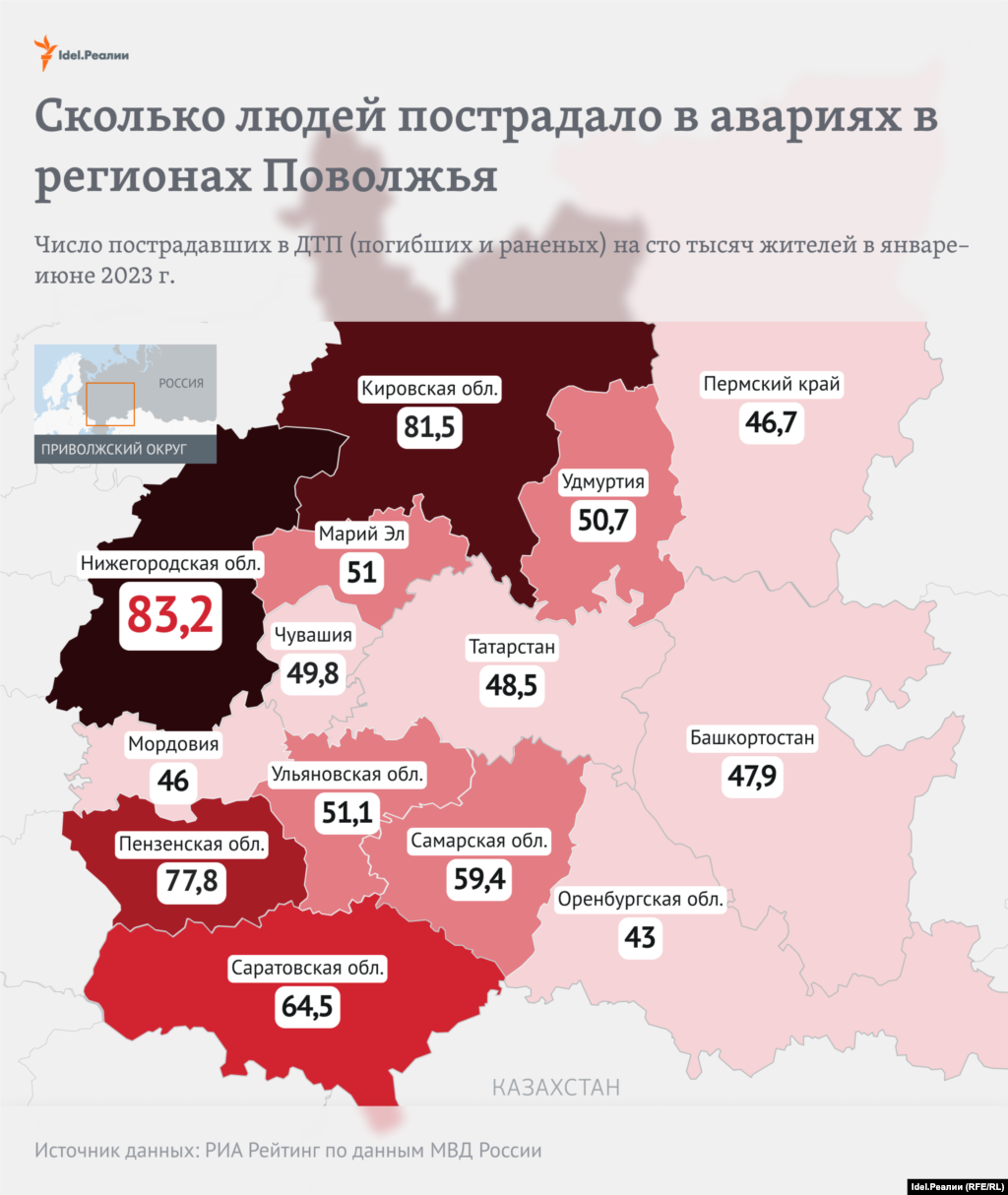 Что касается числа пострадавших в ДТП (раненых или погибших) в первом полугодии 2023 года в Поволжье, то самое низкое оно вновь в Оренбургской области (43 погибших на сто тысяч населения). Следом идут Мордовия (46), Пермский край (46,7) и Башкортостан (47,9). Больше всего пострадавших на сто тысяч населения в Нижегородской области, где значение показателя превышает 83 пострадавших в ДТП на 100 тысяч жителей.