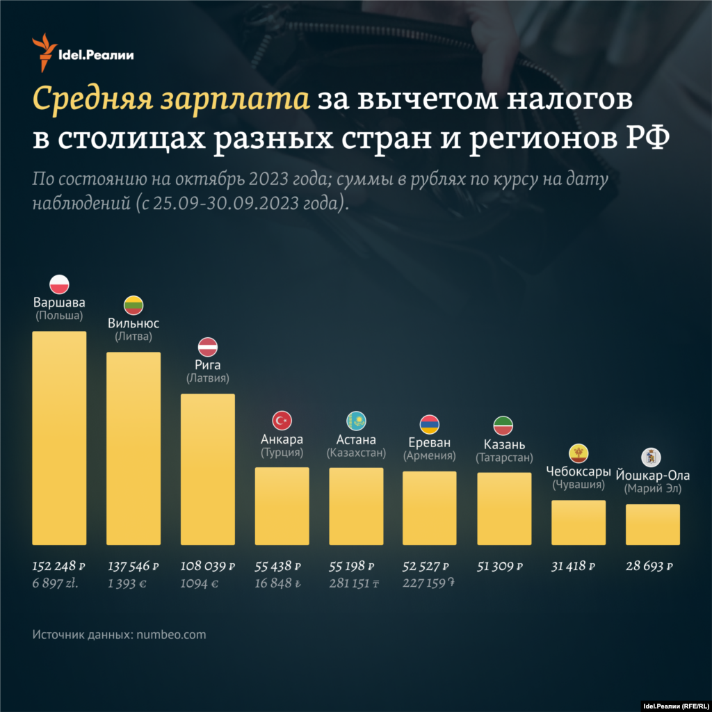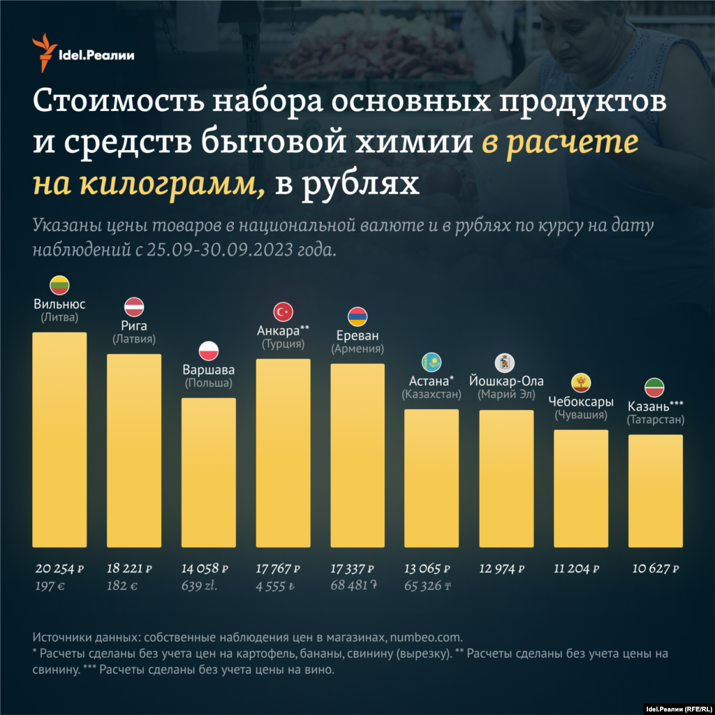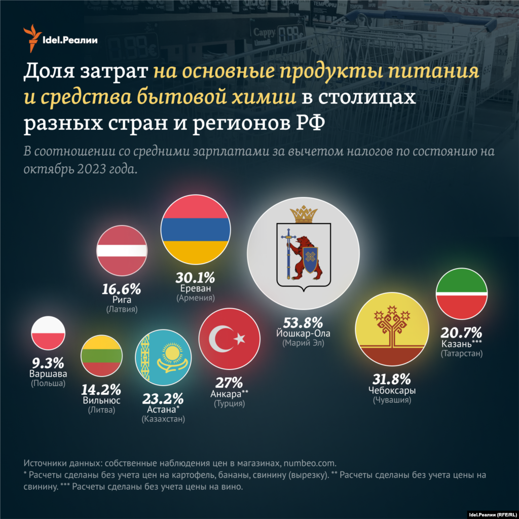 "Idel.Реалии" проанализировали, сколько тратят жители столиц нескольких стран Европы, СНГ и некоторых регионов России на продукты и какую долю это занимает в их зарплатах. Мы сравнивали стоимость продуктов питания и средств бытовой химии в Варшаве (Польша), в Вильнюсе (Литва), в Риге (Латвия), Астане (Казахстан), Ереване (Армения), Йошкар-Оле (Марий Эл), Чебоксарах (Чувашия), Казани (Татарстан).