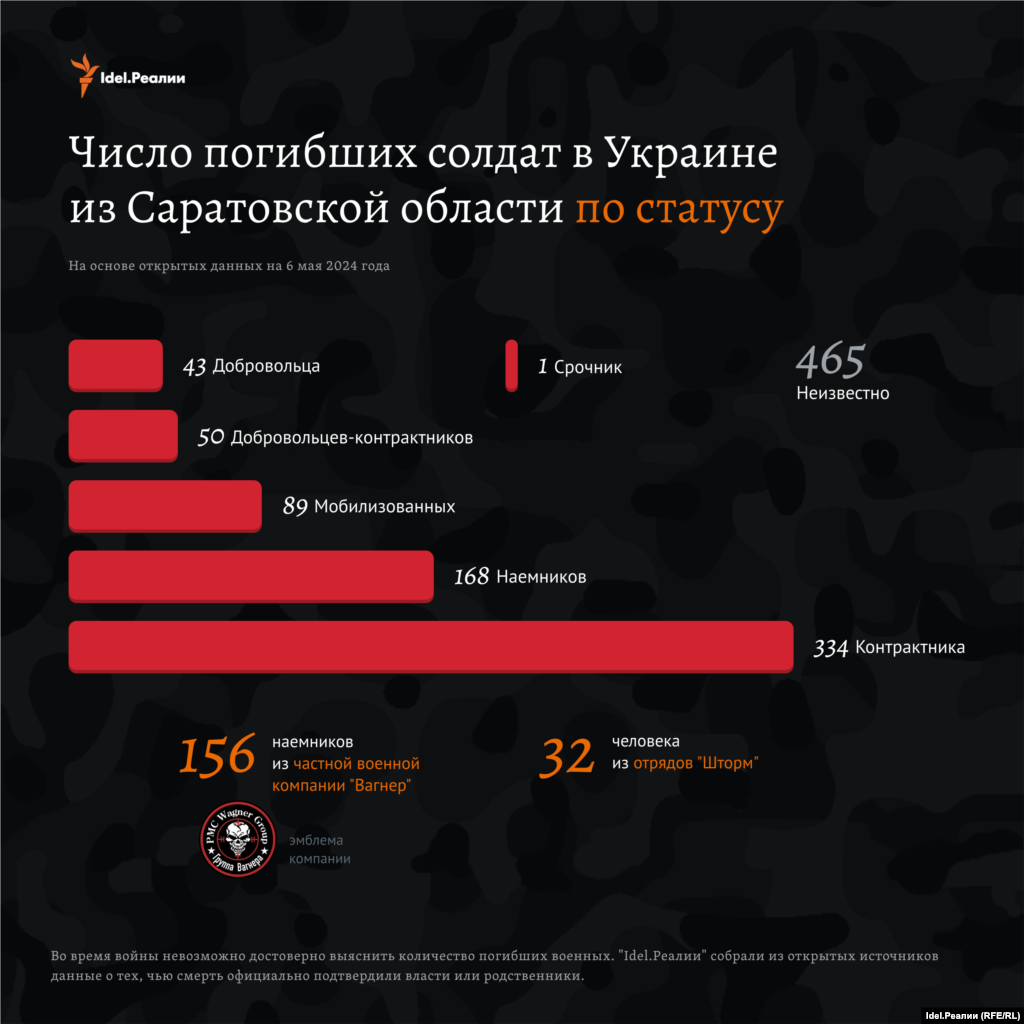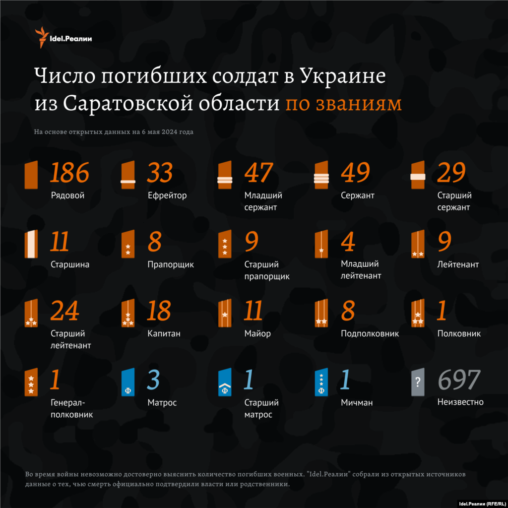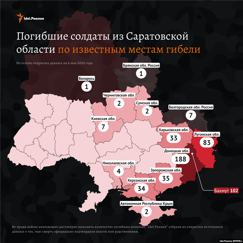 Количество погибших в действительности больше, мы руководствуемся лишь данными из открытых источников. По подсчетам "Idel.Реалии", с начала войны погибли 13 666 уроженцев и жителей Поволжья.