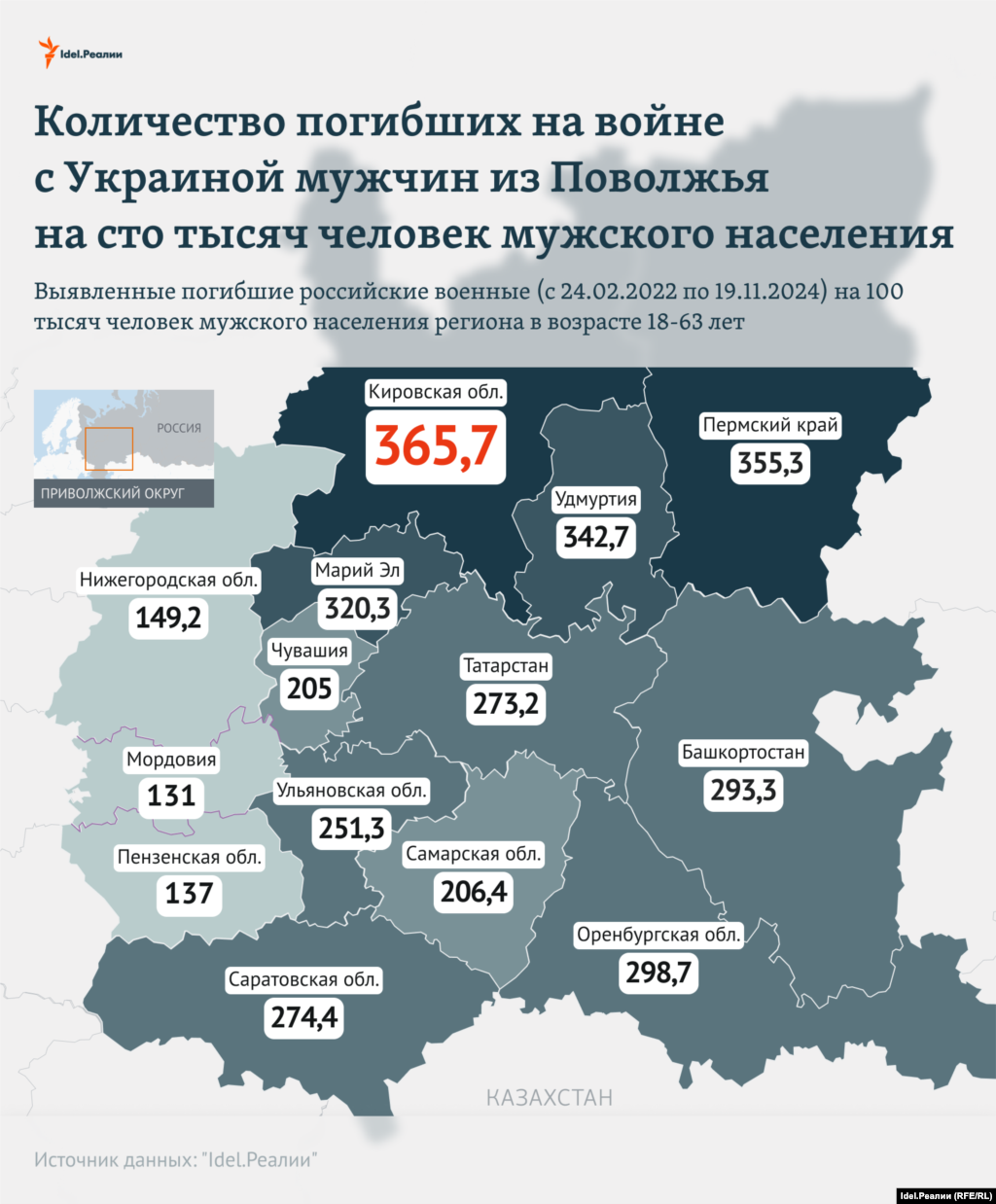 Самое большое количество погибших — из Башкортостана (3 502 человека). На втором месте — Татарстан (3 124 человека). На третьем — Пермский край (2 628 человек). По количеству погибших мужчин на 100 тысяч мужского населения на первом месте — Кировская область с 365,7 погибших. Следом идут Пермский край — 355,3 чел. на 100 тысяч мужского населения, Удмуртия — 342,7 человека на 100 тысяч и Марий Эл — 320,3.