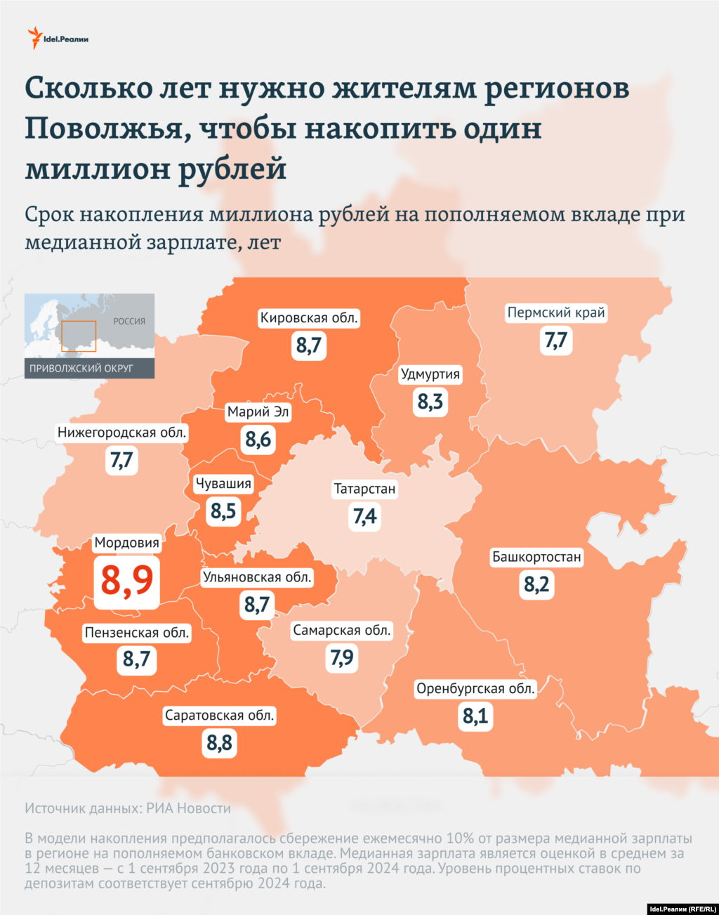 На первом месте среди регионов Поволжья оказался Татарстан — там жителям потребуется 7,4 года. На втором месте по скорости накопления — Нижегородская область и Пермский край, где на накопление одного миллиона рублей потребуется 7,7 года. Следом идут Самарская (7,9 года), Оренбургская области (8,1 года) и Башкортостан (8,2 года).