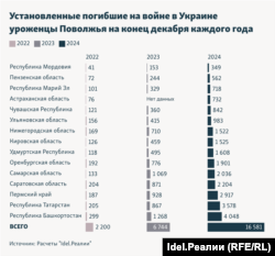 К тысячному дню войны — 19 ноября — список установленных "Idel.Реалии" "двухсотых" из Татарстана увеличился ещё на 124 фамилии. По данным на последнюю декаду декабря, количество установленных погибших в Украине татарстанцев приближалось уже к 3,5 тыс. человек. Опережает республику по количеству убитых на войне уроженцев лишь один регион во всём ПФО и в России в целом — Башкортостан. Здесь потери на конец декабря превысили 4 тысячи человек.