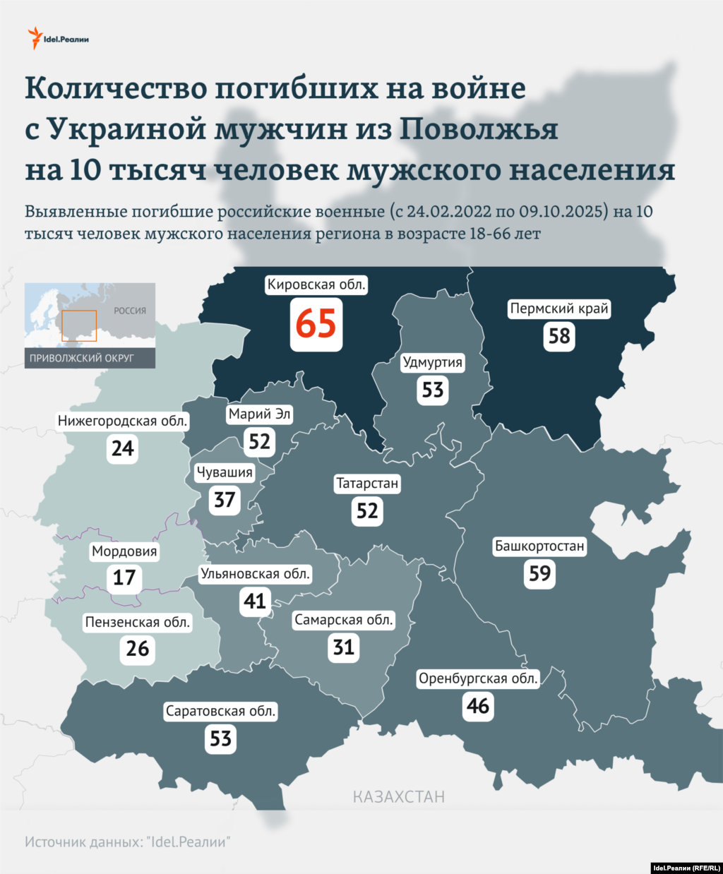 Кировская область вновь стала лидером в Поволжье по количеству погибших на войне против Украины на 10 тысяч мужского населения в возрасте от 18 до 66 лет. Об этом свидетельствуют расчеты "Idel.Реалии" на 9 октября, основанные на данных из базы погибших уроженцев Поволжья с начала полномасштабного вторжения России в Украину.