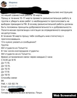 ТОЛЬЯТТИ. Заместитель директора по учебно-методической работе ТГУ Пантыкина М.И. заставляет отчитываться студентов о явке на выборы президента России. Информация опубликована на "Карте нарушений" наблюдательной организации "Голос".