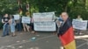 Пикетчик у ворот посольства ФРГ демонстрирует конверт с обращением к канцлеру и Бундестагу Германии.
